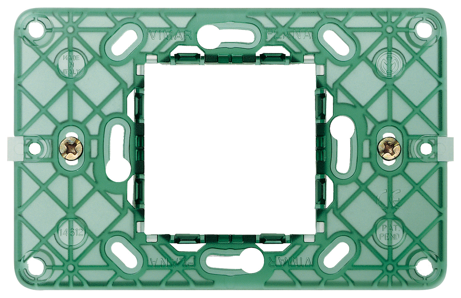Este soporte especial de la serie Plana de Vimar esta diseñado para montar 2 modulos en las posiciones centrales de una caja de registro de 3 espacios. Permite crear configuraciones personalizadas, dejando los extremos libres, con la garantia de un montaje firme y preciso.