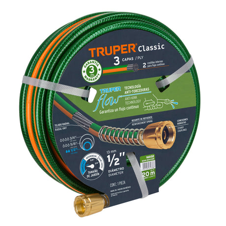 MANGUERA 1/2" REFORZADA 3 CAPAS CONEXIONES DE METAL 20 M MCA TRUPER