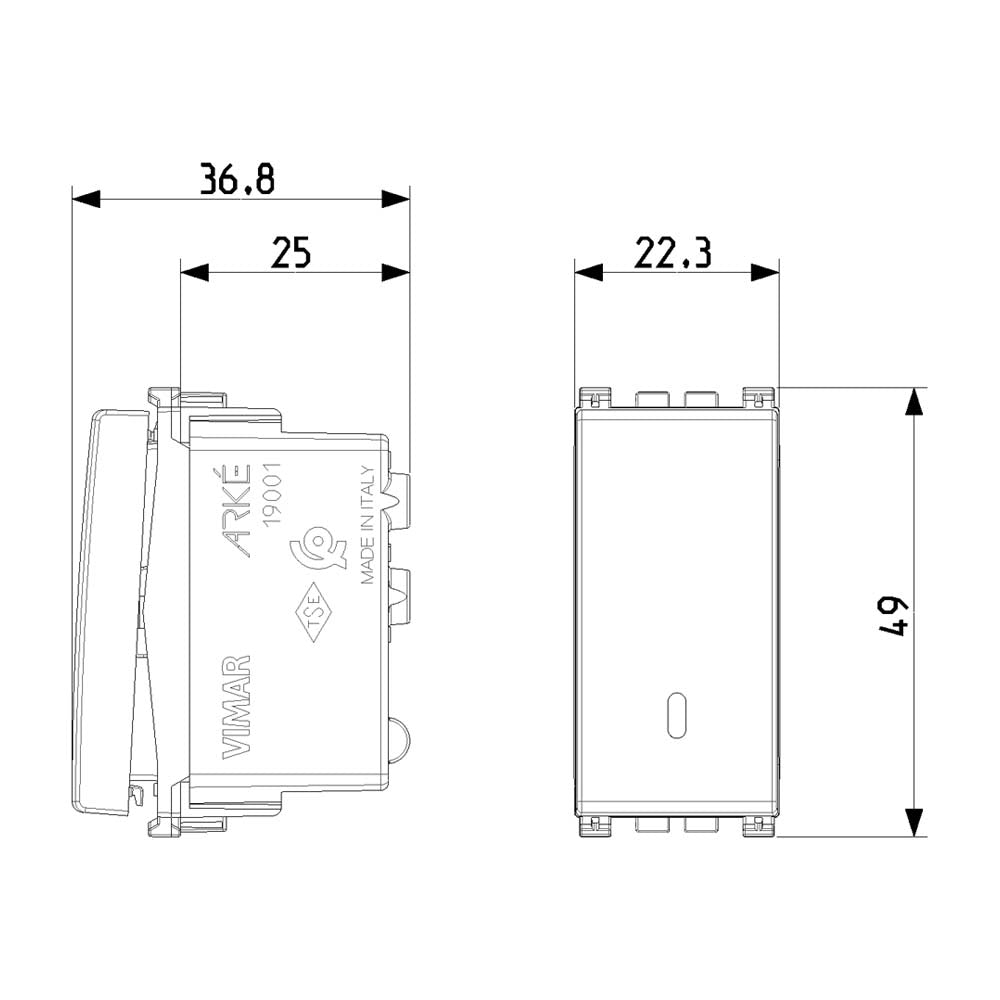 El mecanismo interruptor simple (1 polo) 1P 16 AX 250 V~ modelo 19001 de la serie ARKÉ de VIMAR es iluminable y cuenta con boton reemplazable. Ideal para control de iluminacion desde un punto en ambiente residencial.