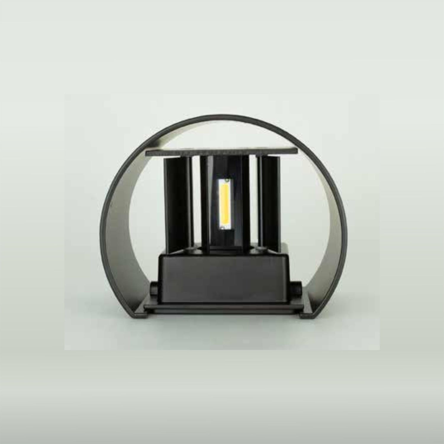 Arbotante de pared con LED integrado de 6W en luz calida (WW). Su diseno incluye aletas o cortadoras de luz ajustables que permiten crear diferentes efectos luminicos en la pared, banando la superficie de luz de forma personalizada. Este es un producto de exhibicion, se conserva como referencia.