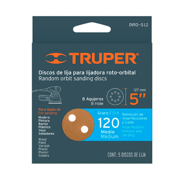 CAJA CON 5 DISCOS DE LIJA 5" GRANO 120 FINO PARA LIJADORA ROTO-ORBITAL DIRO-512 17950 TRUPER