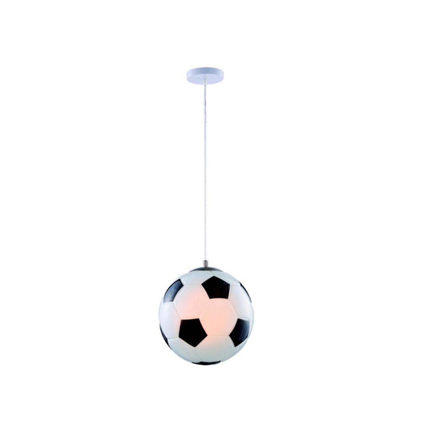 Luminario colgante con pantalla de cristal con diseño tematico tipo soccer (futbol). Utiliza una lampara de hasta 60W (foco no incluido). Ideal para habitaciones infantiles o tematicas. Marca TECNOLITE HOME. Articulo de remate TECNOHOME HASTA AGOTAR LUMI.