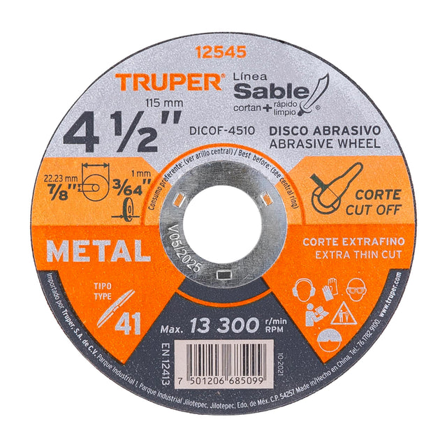 Disco de Corte Fino para Metal 4-1/2 Linea Sable Truper 12545