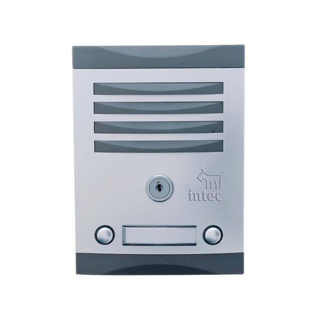 Frente exterior de interfon con 2 botones de llamada marca Intec, modelo TNK-2 diseñado para sistemas de comunicacion residencial. Construccion robusta en plastico de alta resistencia con proteccion contra intemperie. Cada boton permite identificar hasta 2 departamentos o viviendas independientes. Incluye tarjetero para identificacion de residentes. Diseño compacto y discreto que se integra facilmente en cualquier fachada. Compatible con sistemas de interfon Intec de 3 y 4 hilos. Instalacion sencilla en pared mediante tornillos.
