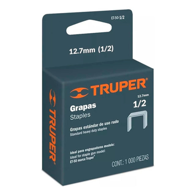 Caja con 1000 grapas de acero de 1/2 pulgada, disenadas para un rendimiento superior con las engrapadoras Truper modelos ET-50 y ET-50X. Fabricadas en acero de alta calidad para una fijacion robusta y segura en trabajos de carpinteria, tapiceria y proyectos de construccion ligera.