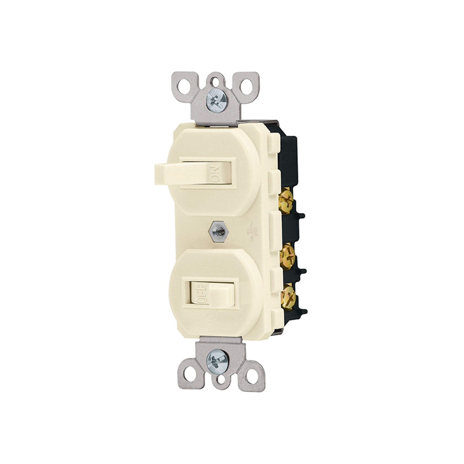 Modulo de interruptor de palanca duplex (doble) con capacidad de 15A a 120V. Acabado en color marfil de la linea STANDARD. Ideal para controlar dos circuitos de iluminacion desde el mismo modulo. Marca TRUPER. Articulo de remate. *** OFRECER LEV001 ***.