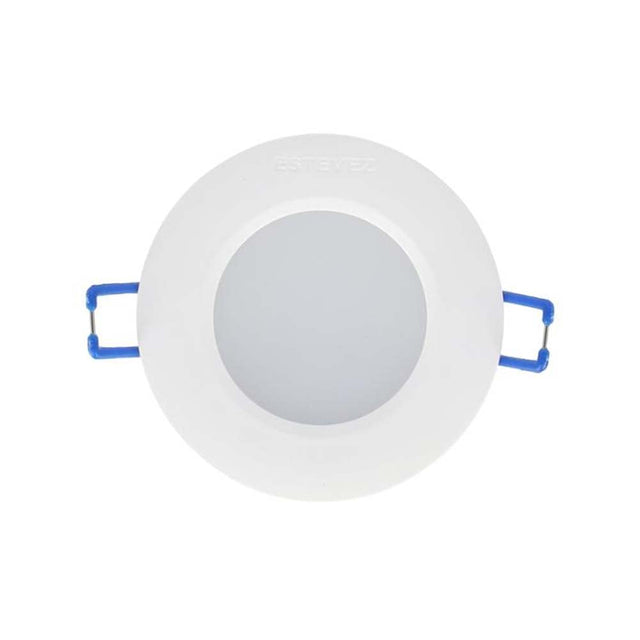 Paquete de 10 luminarios LED redondos para empotrar en plafon de la marca Estevez. Cada uno tiene un consumo de 5W y emite una luz extra calida de 2700K, ideal para crear atmosferas muy intimas y relajantes. Incluyen un driver integrado y son multivoltaje (100-277V), lo que simplifica su instalacion. Su diseno en color blanco se integra discretamente en el techo.