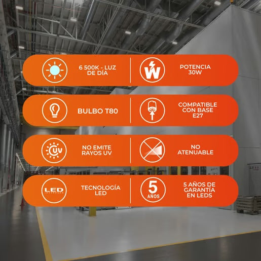 El Kit de 11 Focos LED de alta potencia de Tecnolite es la solucion perfecta para iluminar grandes espacios o areas de doble altura. Cada foco tiene una potencia de **30W** y emite **2700 lumenes** de **luz de d?a (6500K)**, proporcionando una iluminacion clara y brillante. Utiliza la base estandar **E27** y es **Multivoltaje (100V-240V)**. Su diseno robusto y su angulo de apertura amplio (220 grados) lo hacen ideal para bodegas, talleres, oficinas o cualquier lugar que requiera alta visibilidad.