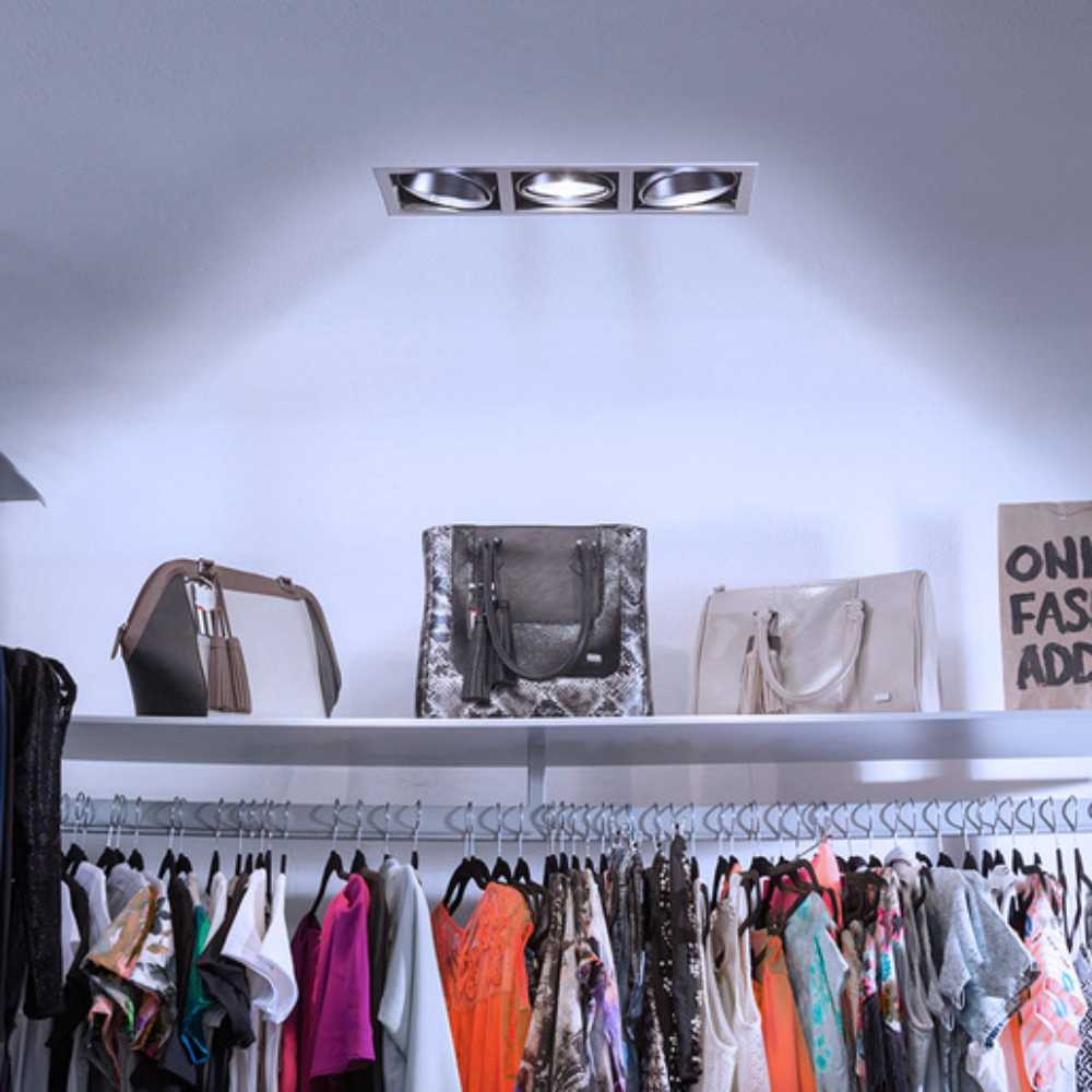 Iluminacion de acento profesional con el kit de 3 focos LED AR111 de Tecnolite. Cada foco de 15W emite una luz de dia (6500K) y es atenuable. Utilizan base G53 y operan a 24V. Ideales para vitrinas, galerias y comercios.