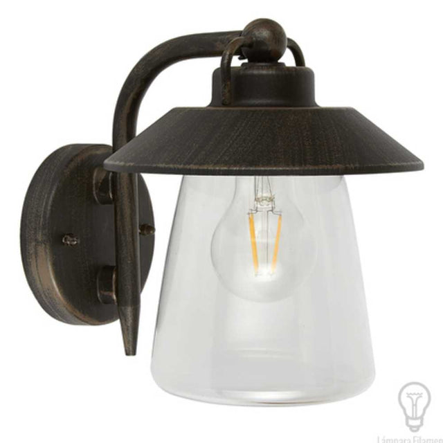 El Kit de 2 faroles Spica de Tecnolite es un luminario de pared para exterior, de formato compacto y estilo farol clasico. Utiliza una base E27 para foco (no incluido) con una potencia sugerida de 20W (maximo 60W). Fabricado en aluminio con acabado en bronce antiguo y pantalla de cristal. Con IP44, es resistente a salpicaduras para su uso en exteriores bajo techo, perfecto para iluminar zonas mas pequenas como balcones o pasillos exteriores.