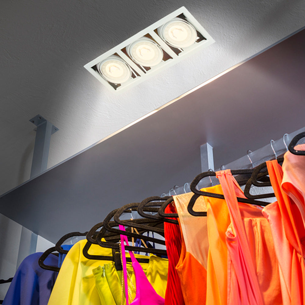 El Kit de 2 luminarios empotrables Arco de Tecnolite es una solucion de iluminacion de acento para interiores. Cada luminario utiliza 3 focos con base GU5.3 (no incluidos), con una potencia maxima de 50W por foco, ofreciendo una potente iluminacion tipo downlight. Son ideales para instalar en plafones de salas, pasillos o comercios, permitiendo el uso de focos MR16 halogenos o LED para obtener la intensidad y temperatura de color deseada.