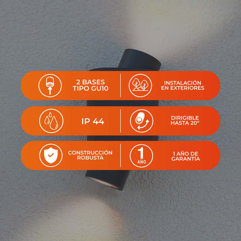 El Kit de 2 Arbotantes de pared Ukul I de Tecnolite es un luminario exterior con doble salida de luz dirigible. Cada arbotante utiliza 2 bases GU10 (focos no incluidos) con una potencia maxima de 12W por base, permitiendo enfocar el haz de luz hasta 20 grados. Su acabado en negro y su proteccion IP44 lo hacen ideal para sobreponer en muros exteriores bajo techo, ofreciendo versatilidad en el diseno de iluminacion de acento para fachadas y jardines. Es compatible con focos LED inteligentes atenuables.