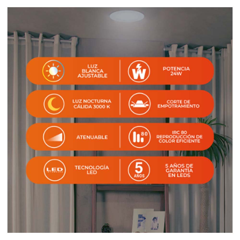 El Kit de 3 Downlights LED Ainala III de Tecnolite es un luminario de empotrar para interiores de alta eficiencia. Cada downlight de 18W ofrece la funcion CCT (Temperatura de Color Cambiable), permitiendo seleccionar entre luz calida (3000K), neutra (4000K) o de dia (6500K). Proporciona 1500 lumenes y es ideal para plafones y techos falsos. Su diseno discreto en color blanco se integra perfectamente, brindando una luz uniforme y potente.