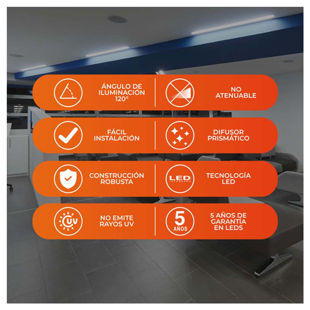 El Kit de 4 Luminarios Lineales LED Leda II de Tecnolite es la solucion ideal para iluminacion general en espacios amplios de interior. Cada luminario de **1.2 metros** de longitud utiliza un LED integrado de **36W** para entregar un flujo luminoso de **3240 lumenes** con **Luz de Dia (6500K)**. Su diseno delgado y discreto (24 mm de altura) permite una instalacion sencilla de sobreponer en techo. Perfecto para oficinas, pasillos, cocinas industriales y areas de trabajo. No es atenuable ni interconectable.