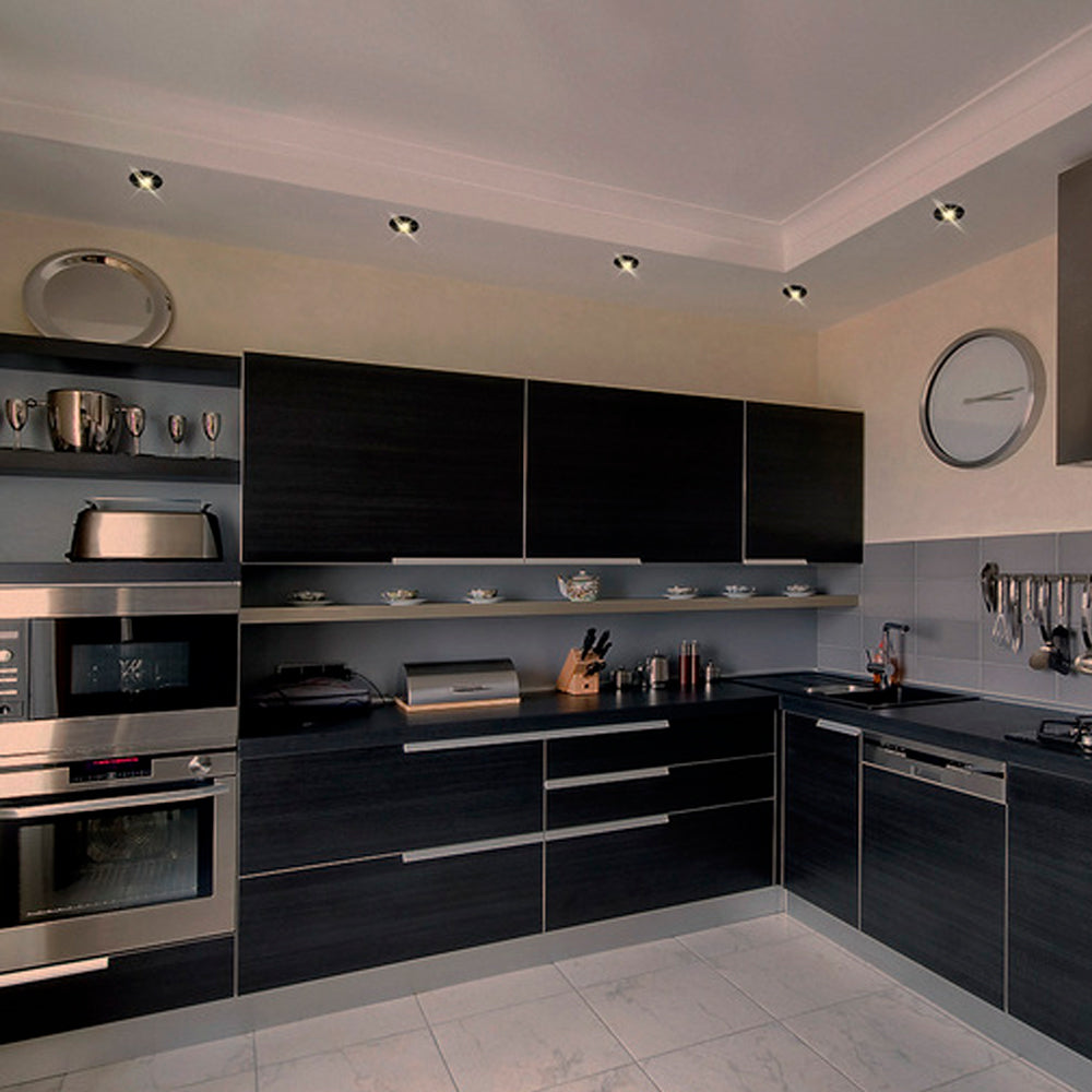 El Kit de 7 luminarios empotrables Aprica de Tecnolite presenta un acabado en negro para un look moderno y de contraste en la iluminacion interior. Compatible con foco MR16 de base GX5.3 (no incluido) con potencia maxima de 50W. Son ideales para aplicaciones donde se busca definir el punto de luz, como en tiendas, museos o galerias. Permiten la direccion de la luz al ser compatibles con focos MR16 dirigibles.