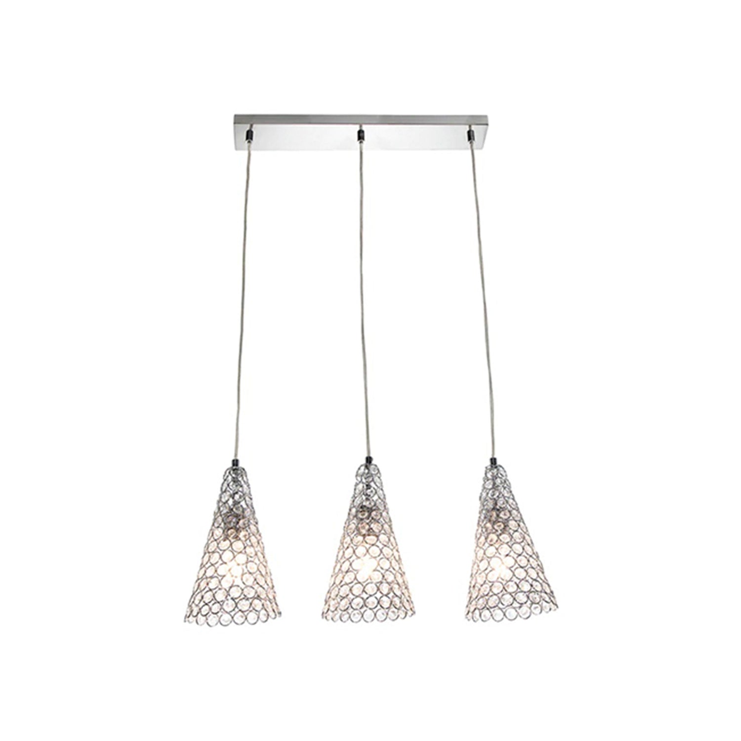 Lampara colgante de la marca Ike Lite con capacidad para tres focos de 40W. Su diseno combina el acabado en cromo con detalles transparentes, creando una pieza moderna y luminosa para comedores o salas. Articulo descontinuado.