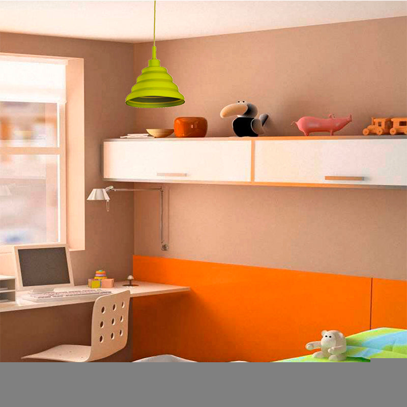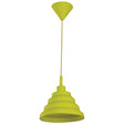 Lampara colgante de la linea Inlite de Lumimexico. Su diseno moderno en un vibrante color verde limon la convierte en una pieza divertida para cocinas, comedores o habitaciones juveniles. Para un foco (base no especificada). Este es un producto de exhibicion, se conserva como referencia.