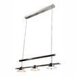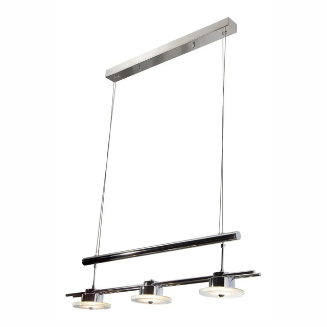 Lampara colgante de la marca Lumimexico con tecnologia LED integrada. Su diseno de 3 luces en acabado cromo es moderno e ideal para instalar sobre barras o islas de cocina, proporcionando una iluminacion eficiente. Este es un producto de exhibicion, se conserva como referencia.
