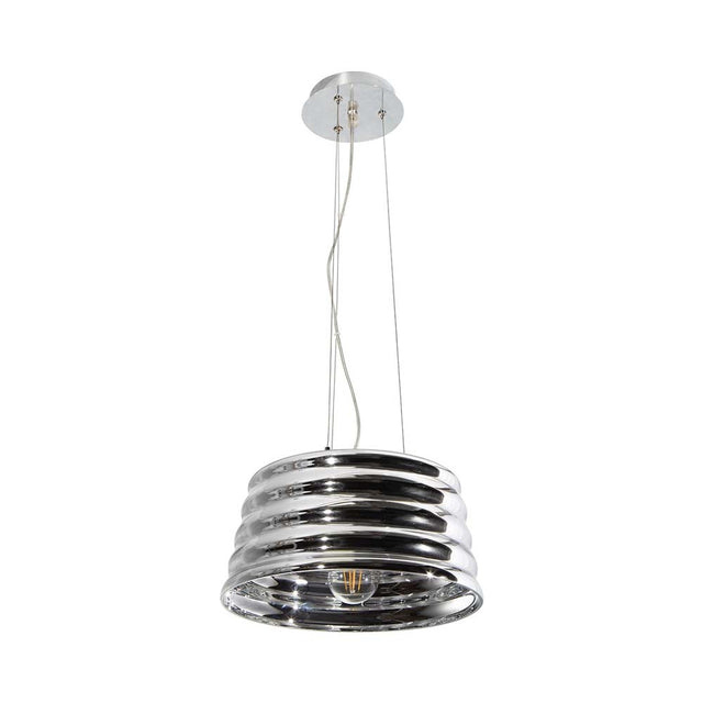 Lampara colgante de Lumimexico de una luz, disenada para un foco E27 de alta potencia, hasta 100W (no incluido). Su diseno combina acabados en niquel satinado y cromo. Mide 30x19 cm. Articulo descontinuado, conservado para referencia.