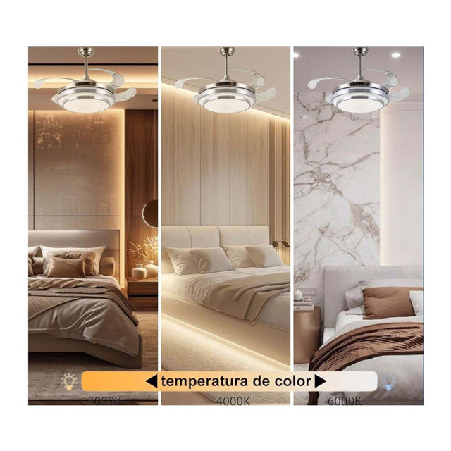 Combina diseno elegante y funcionalidad. Cuenta con aspas retractiles y una lampara LED de 82W con tres tonos de luz ajustables: fria, calida y neutra. Ofrece tres velocidades de ventilacion y un motor silencioso, ideal para cualquier espacio.