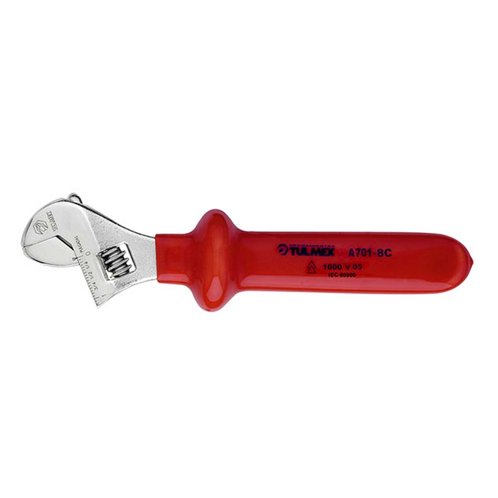 La llave ajustable A701-8C de Klein Tools esta disenada para la seguridad del electricista. Con una longitud de 8 pulgadas y un acabado cromado resistente a la corrosion, esta herramienta cuenta con un aislamiento que protege hasta 1000V. Es una herramienta esencial para trabajar en o cerca de equipos energizados, combinando la versatilidad de una llave perico con la proteccion del aislamiento.
