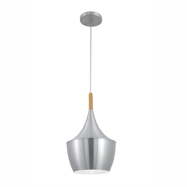 Luminario colgante modelo Tempo de Tecnolite Home. Su diseno combina una pantalla de metal en acabado satinado con un detalle superior de madera, aportando un toque nordico y calido. Para un foco de hasta 60W (no incluido). Este producto se encuentra descontinuado, la informacion se proporciona como referencia.