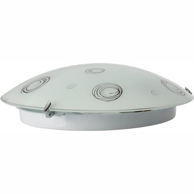 Luminario de sobreponer tipo plafon con diseño de circulos y acabado cromado. Diametro de 25 cm. Utiliza lampara de base E26 de hasta 60W (foco no incluido). Marca ESTEVEZ. Articulo UNICO de EXHIBICION. *** EXHIBIDO ***.