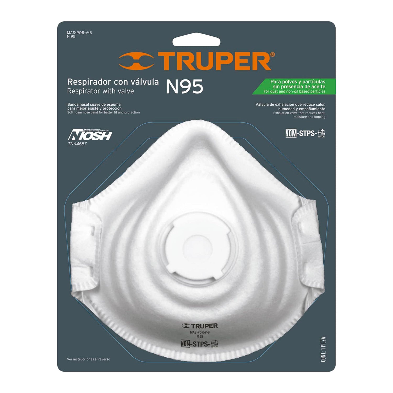 Esta mascarilla de Truper ofrece proteccion respiratoria contra polvos y niveles molestos de vapores organicos (como los de pinturas base solvente). Su diseno de concha con una valvula de exhalacion reduce el calor y la humedad en el interior, proporcionando mayor comodidad durante su uso. Cuenta con doble banda elastica y clip nasal para un ajuste seguro.